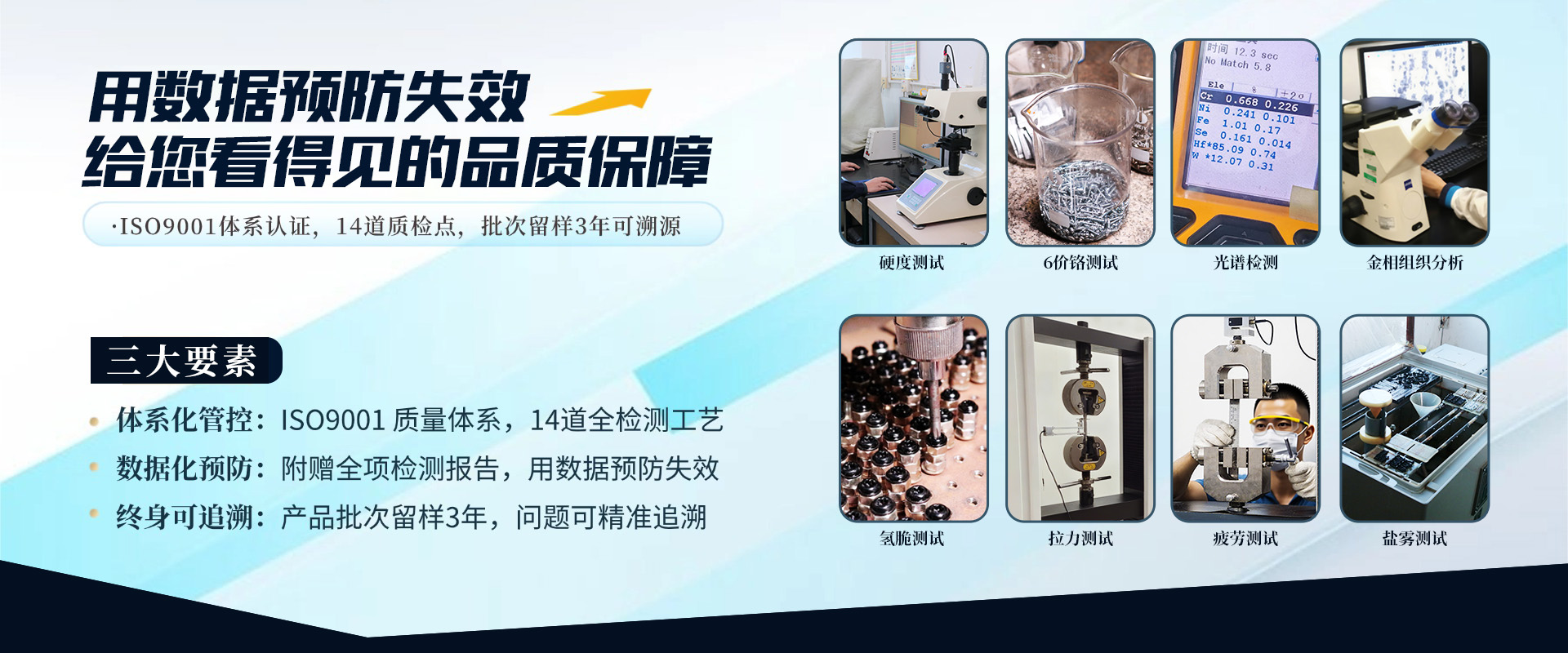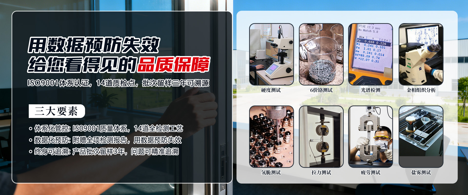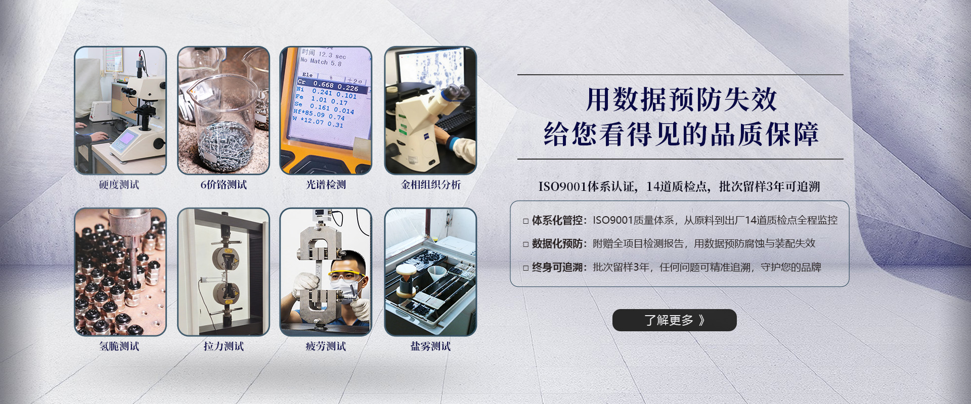 专业螺丝检测实验室:拉力测试,盐雾测试,6价铬测试,硬度测试,镀层测试,疲劳测试,扭矩测试,精度测试,光谱测试等